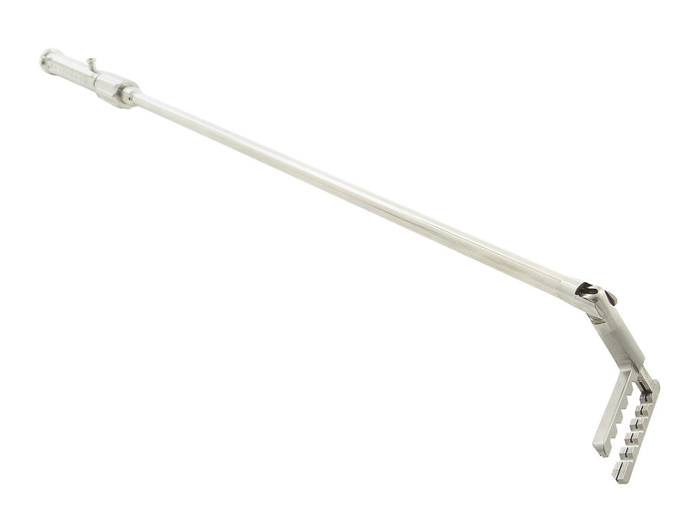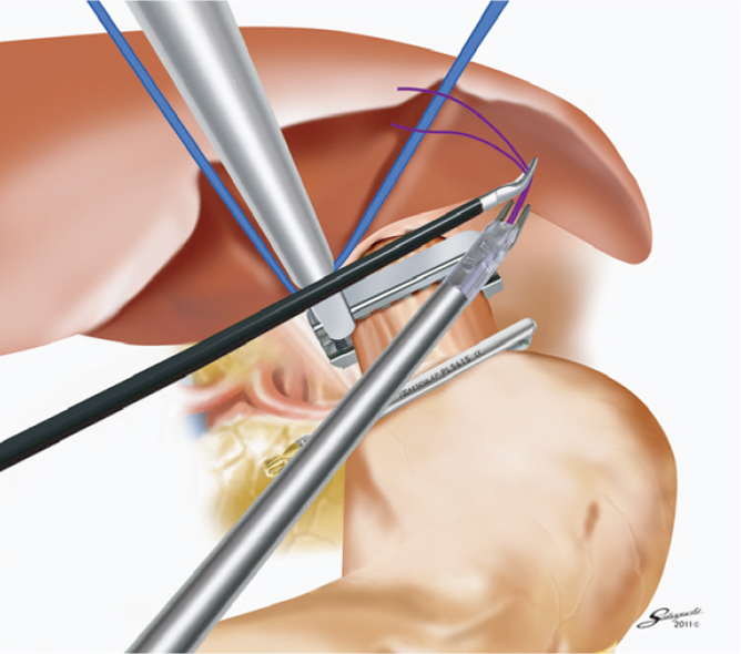 近年注目されている食道胃接合部癌において、サーキュラーステイプラーによる食道空腸吻合法を鏡視下で行うために、針を挿入する把持部が曲がるようにしました。